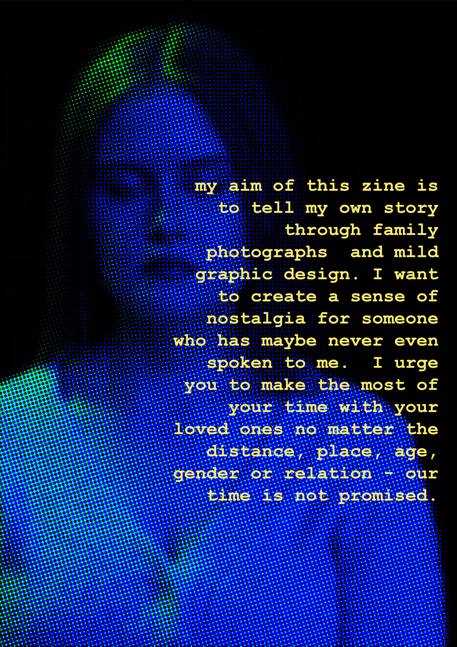This project is very personal to me and my family, it covers the themes of loss, love, and living in time here and now. Using archival photographs from my family and our background I have created an editorial zine following our lives and all the emotions that came with it.